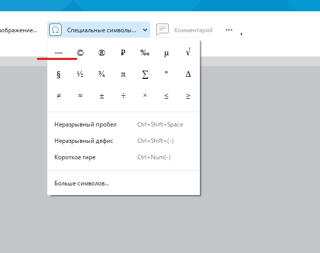 Как и в случае с тире, неразрывный пробел также можно добавить через меню «Специальные символы».